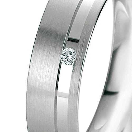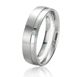 Finition de l’alliance polie brossée. Alliance sertie d’un diamant taille brillant d’un poids de 0.02 ct. Le diamant a une couleur « G » et une pureté « VS ». La largeur de l’alliance est 5.5 mm. L’épaisseur de l’alliance est 1.6 mm.
