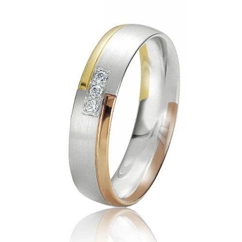 Alliance diamants en or blanc, jaune et rose.