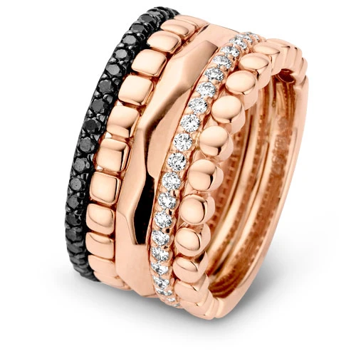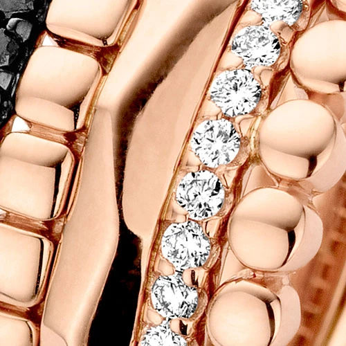 Les alliances diamants se situent à la deuxième rangée pour les diamants blanc et à l’extrémité de la bague pour l’alliance diamants noirs; donnant vie aux trois alliances en or de formes différentes.
