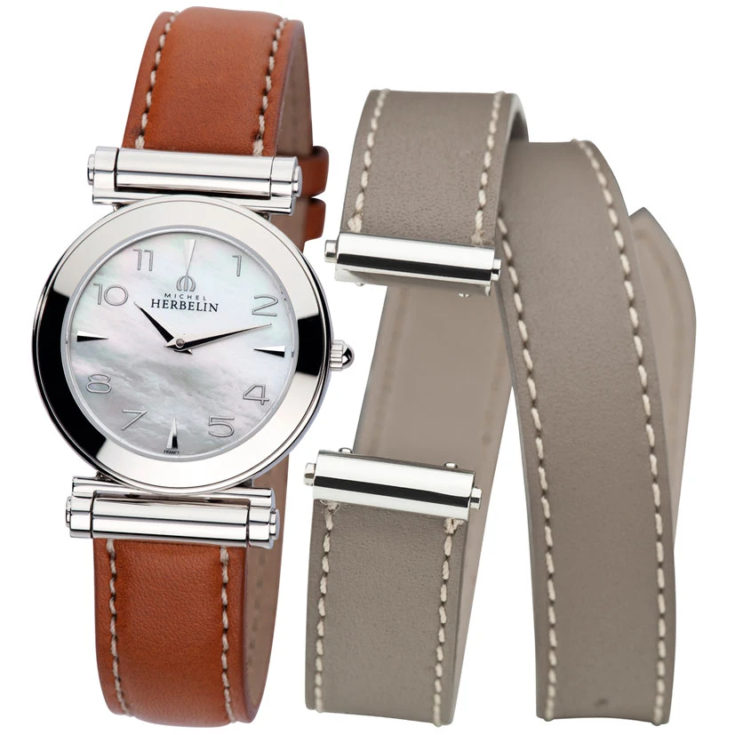 Cette montre Herbelin est livrée avec un bracelet cuir de couleur gold et un bracelet double tour de couleur taupe.