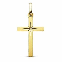 Cette croix diamantée au centre, à la finition satiné diamanté est en Or Jaune 18 carats.