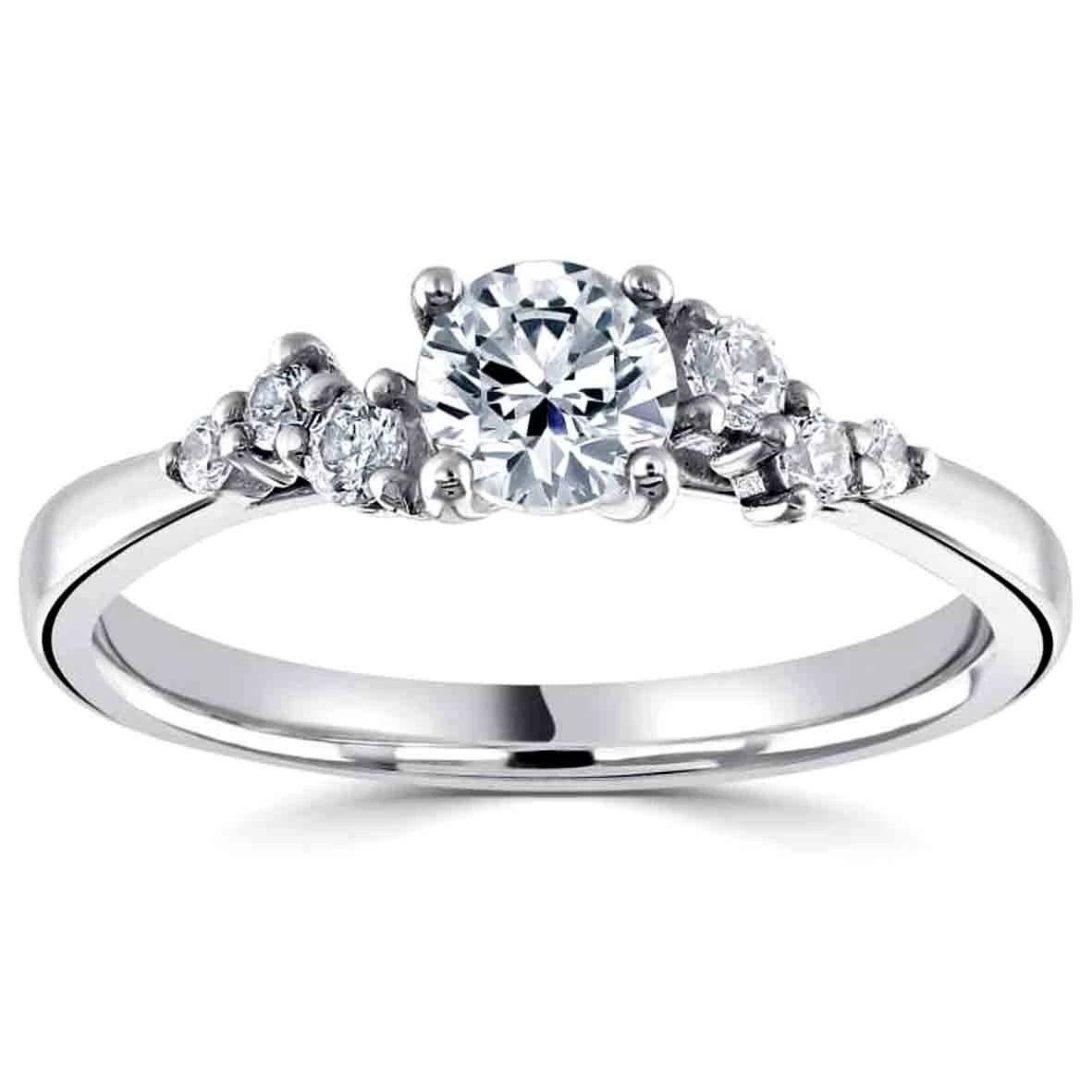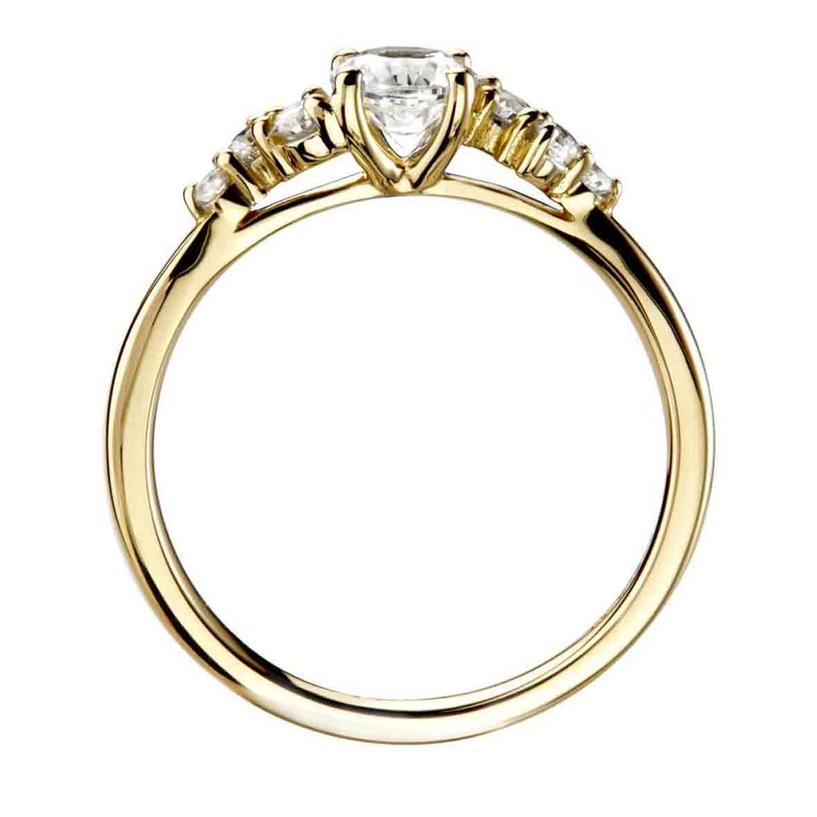 Le corps s’affine vers le châton avec trois diamants de grosseurs différentes sertis de chaque côté de la bague