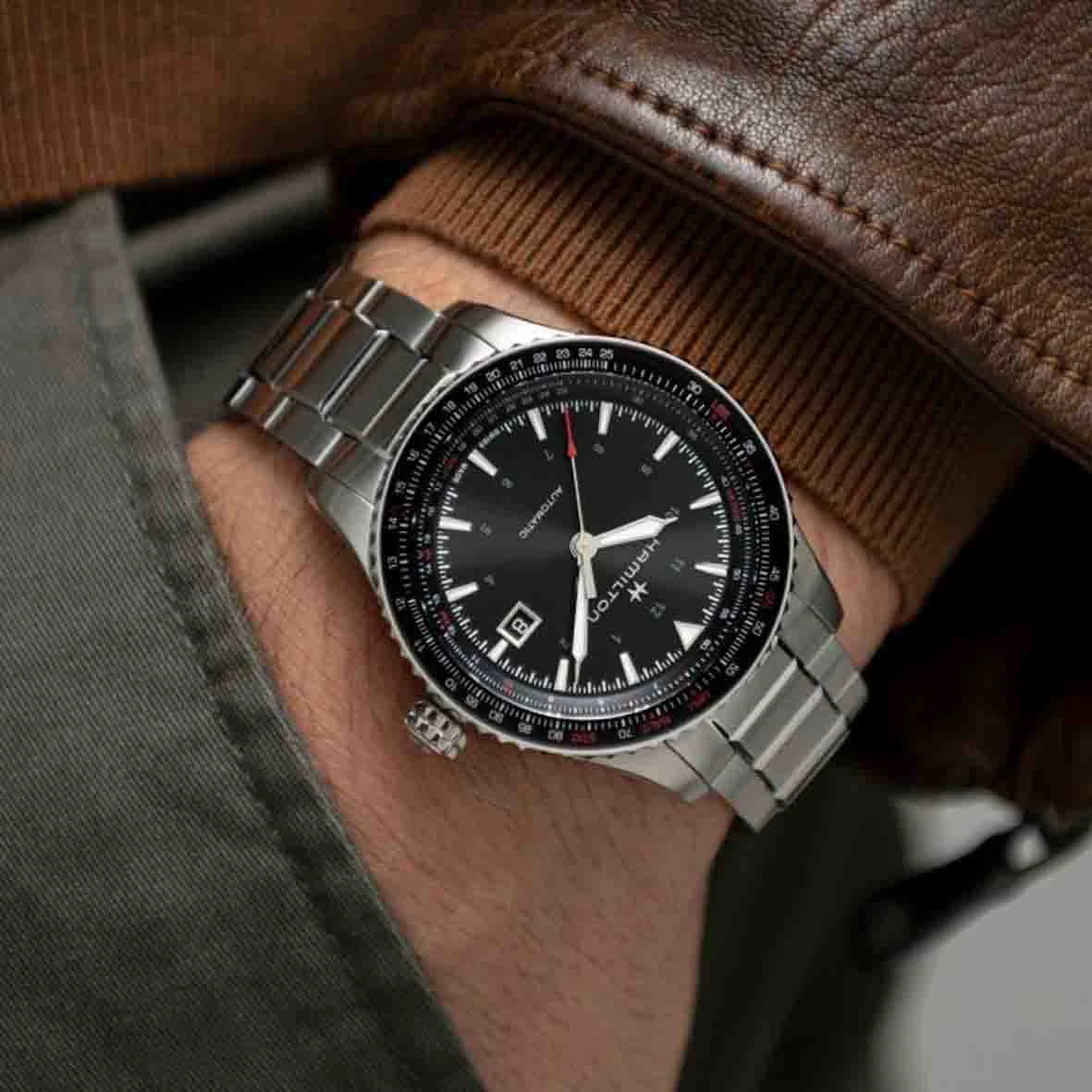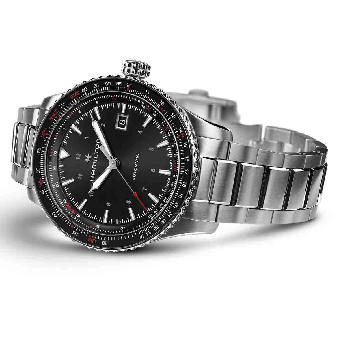 le cadran noir épuré de 42 mm renferme le mouvement à remontage automatique H-10 doté d’une réserve de marche de 80 heures.