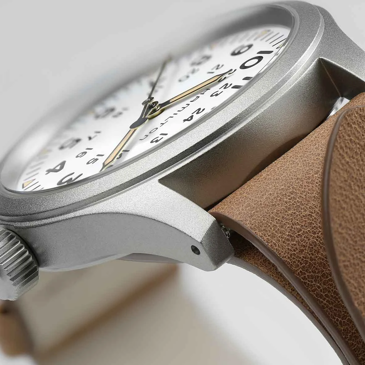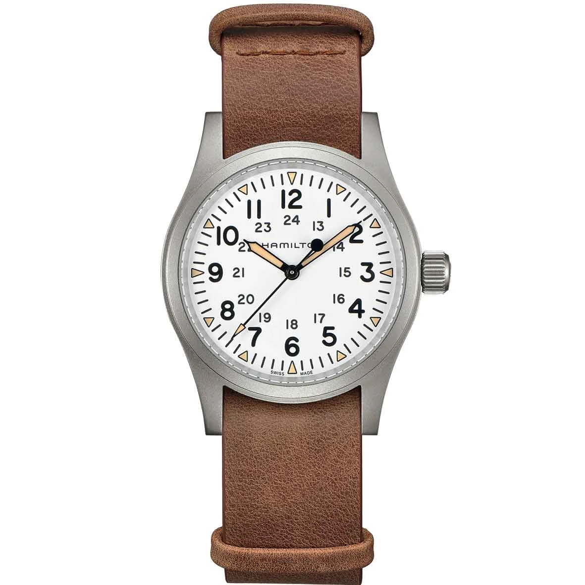 Boîtier en acier inoxydable de 38 mm, trois aiguilles, cadran sombre avec chiffres clairs, index triangulaires avec Super-LumiNova® radium vintage et bracelet NATO résistant : la nouvelle Khaki Field Mechanical est une fidèle reproduction de son ancêtre des années 60, véritable hommage à l’héritage militaire d’Hamilton. Le boîtier de cette montre militaire originale est désormais traité PVD « terre », une couleur propre à Hamilton.