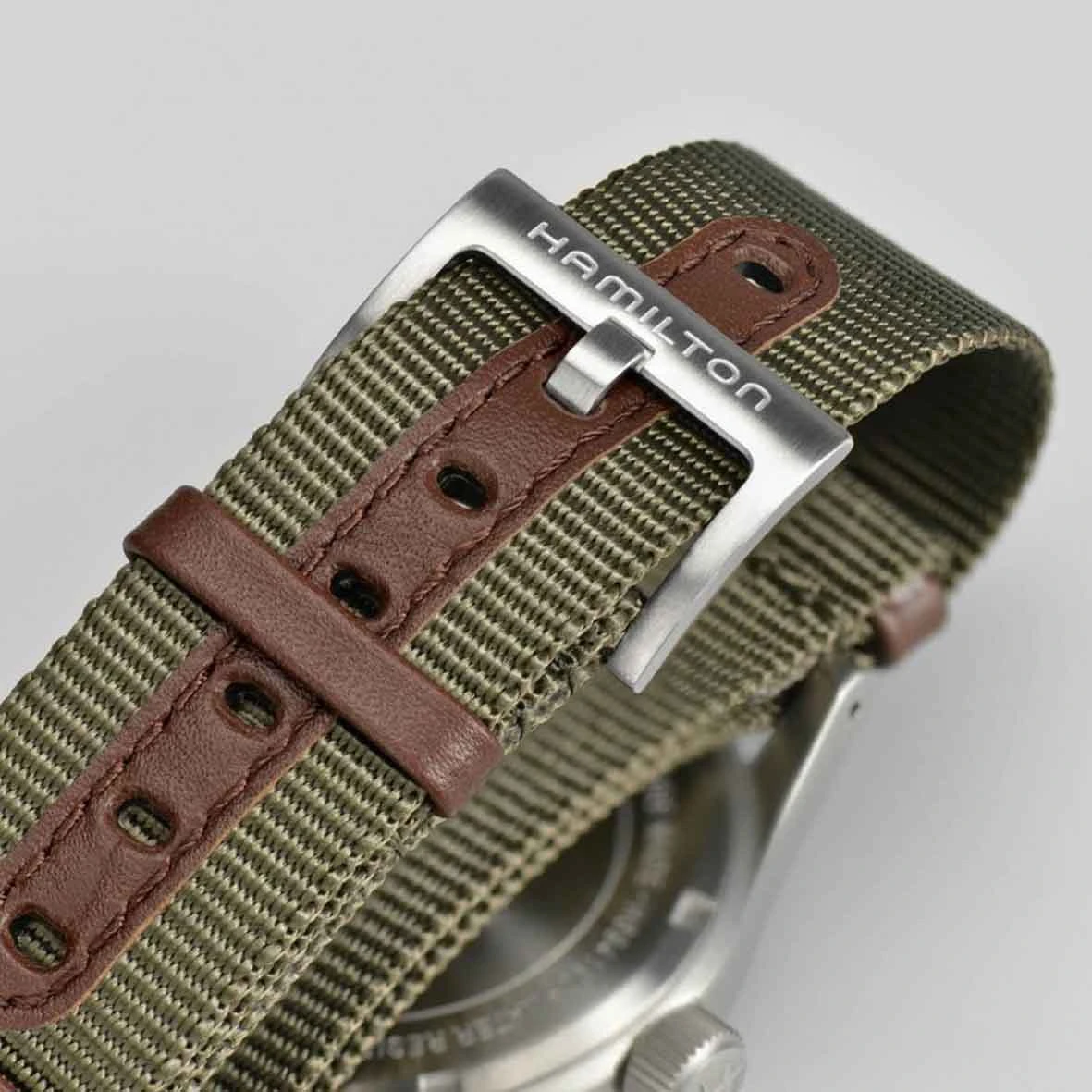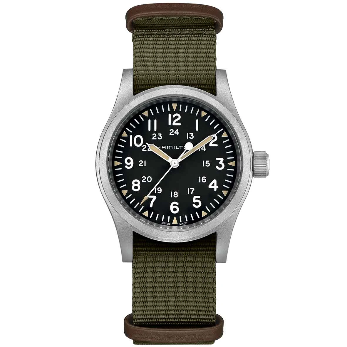 Boîtier en acier inoxydable de 38 mm, trois aiguilles, cadran sombre avec chiffres clairs, index triangulaires avec Super-LumiNova® radium vintage et bracelet NATO résistant : la nouvelle Khaki Field Mechanical est une fidèle reproduction de son ancêtre des années 60, véritable hommage à l’héritage militaire d’Hamilton. Le boîtier de cette montre militaire originale est désormais traité PVD « terre », une couleur propre à Hamilton.