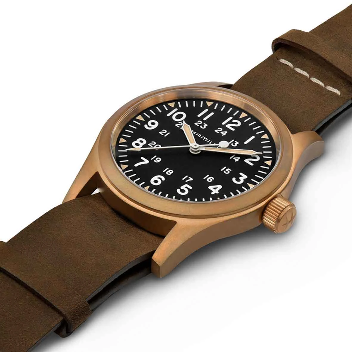 Chaque Khaki Field Mechanical Bronze possède sa propre histoire qui s’écrira selon son propriétaire, puisque son boîtier acquerra une patine unique au fil du temps.
