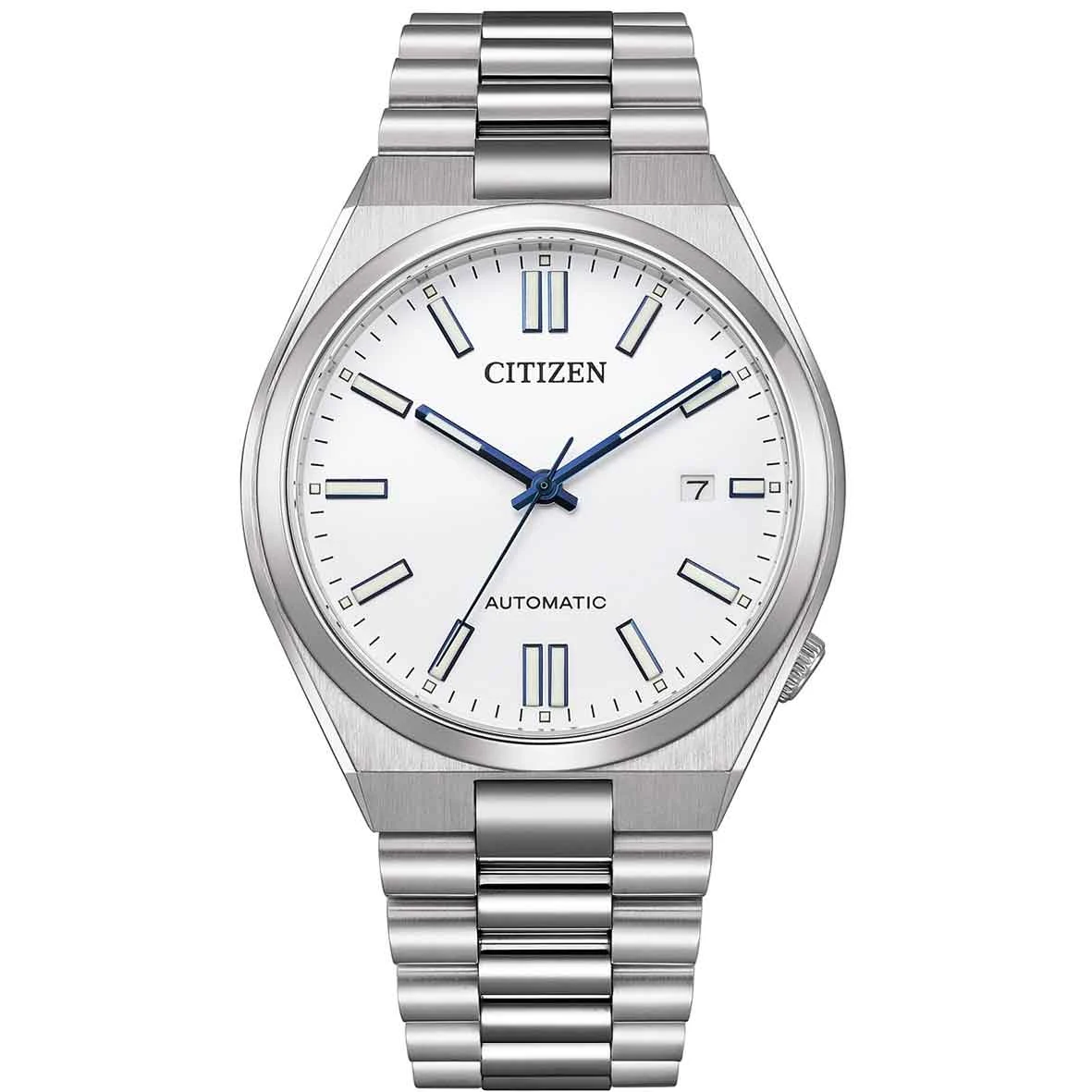 Le bracelet en acier inoxydable de la montre Citizen complète parfaitement le cadran blanc