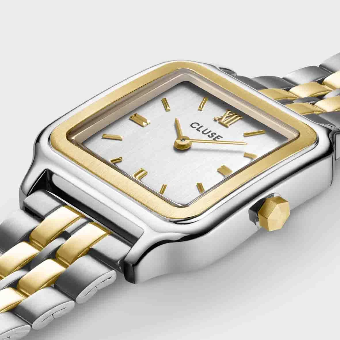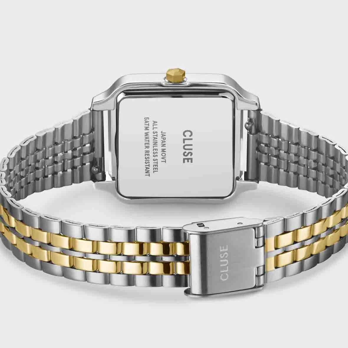 Elle se compose d’un boîtier carré de 28 mm de couleur or et argent, associé à un cadran blanc et à un bracelet en acier inoxydable or et argent de 16 mm.