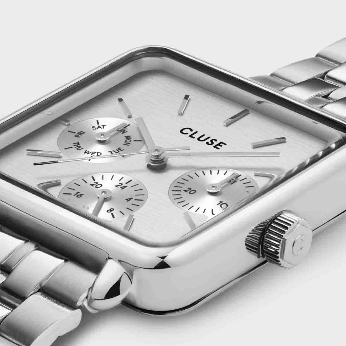 Arborant un boîtier carré argenté de 30 mm, un bracelet à 5 maillons et 3 sous-cadrans pour suivre le jour et l’heure, cette montre intégralement argentée ne se démode jamais.
