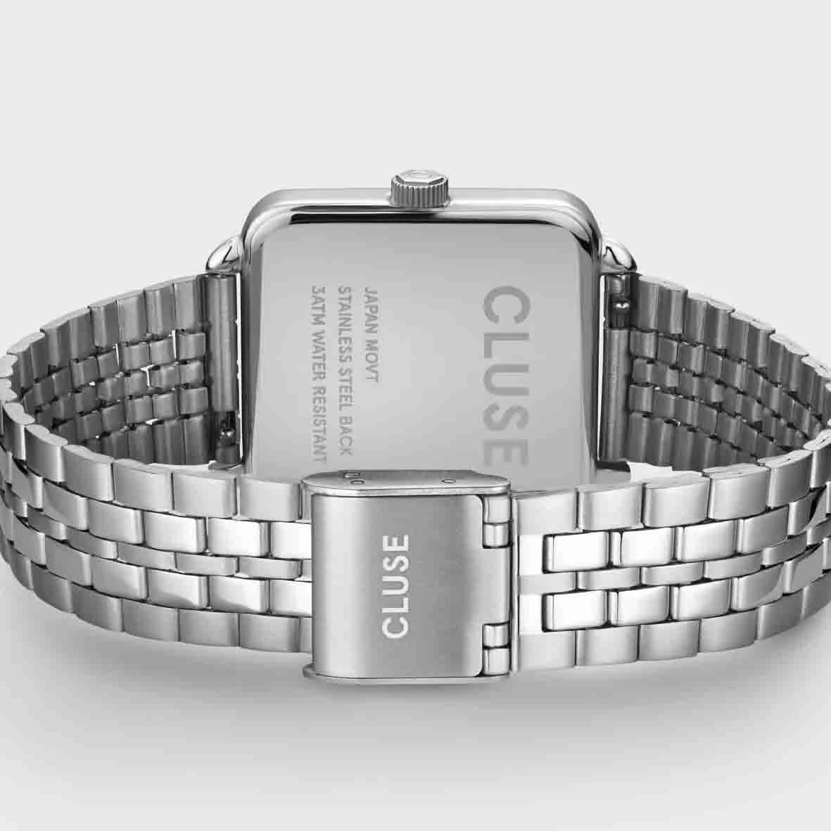Le bracelet en acier inoxydable à 5 maillons, dans une teinte argentée assortie, complète parfaitement le design élégant de la montre, offrant un confort optimal tout en restant tendance.