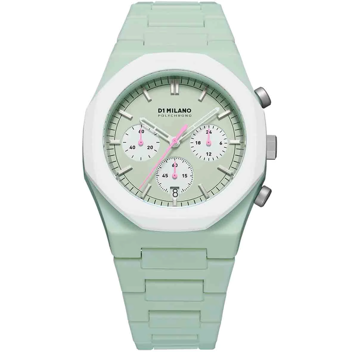Relooker l’esthétique montre monochrome emblématique avec son design en polycarbonate doux au toucher avec une touche de vert pastel sur le poignet.
