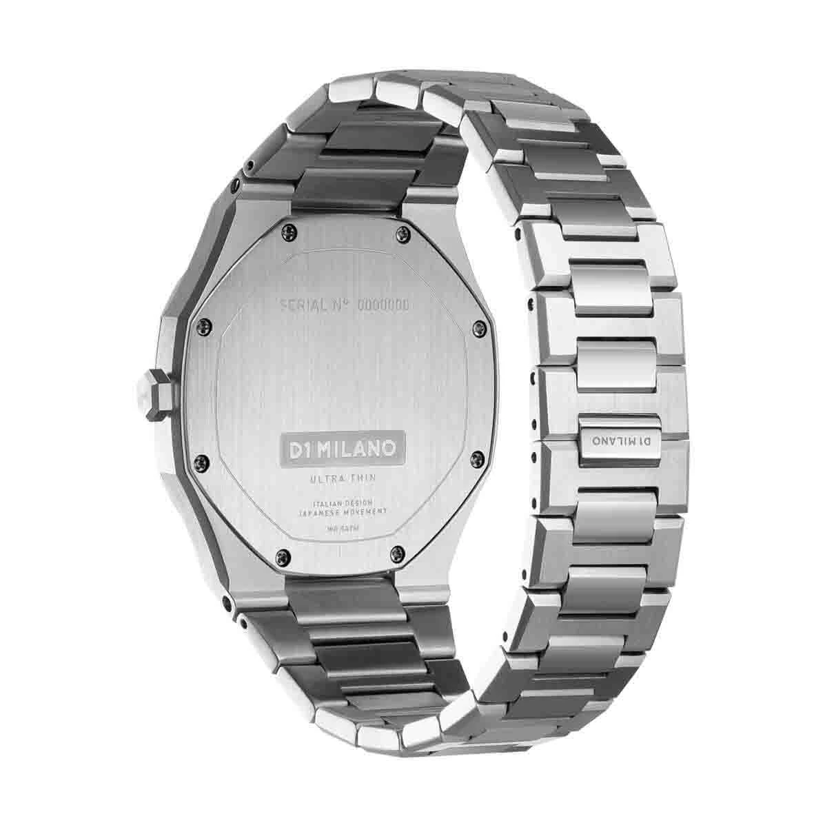 Le fond de la boîte a huit vis permettant d’ouvrir la montre et de voir le mouvement fonctionner. la marque D1Milano est gravée au dos.