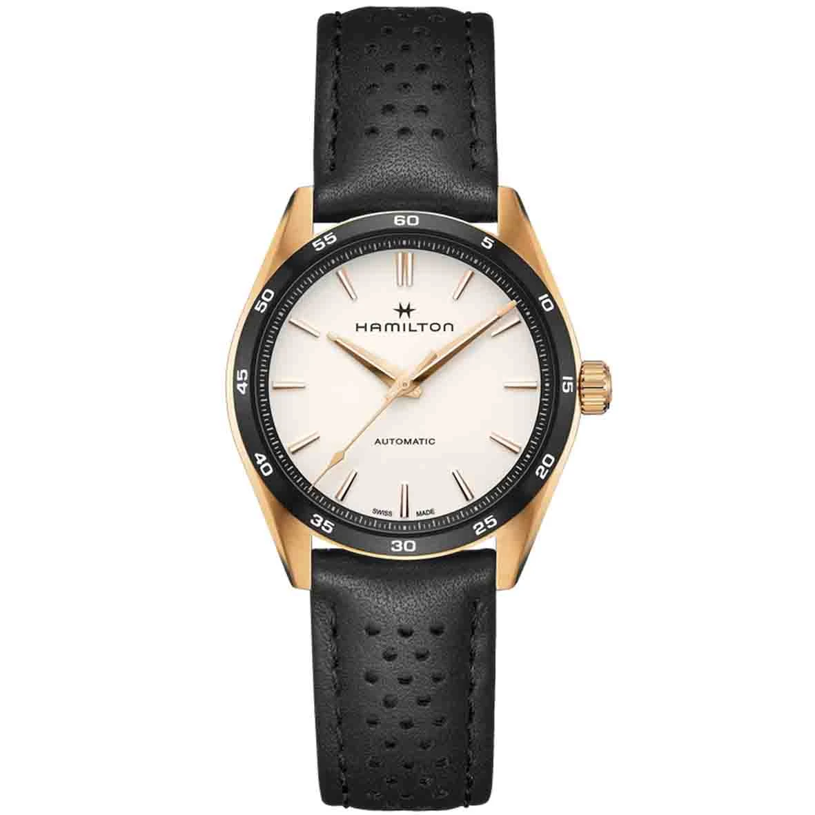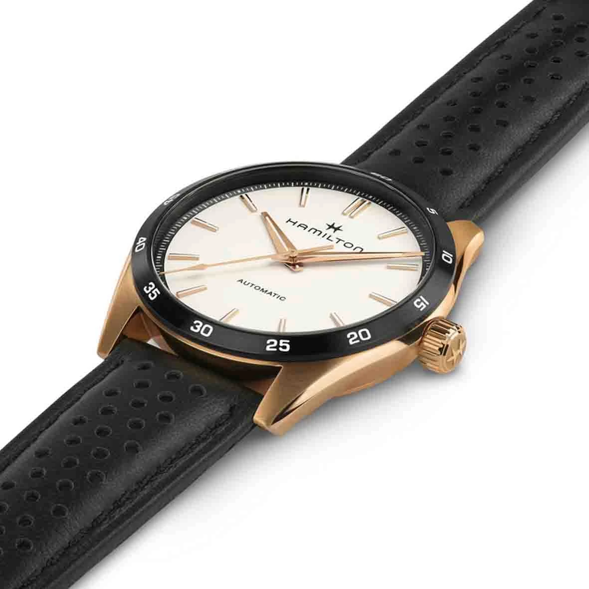Animée par le mouvement automatique H-10 avec une réserve de marche de 80 heures, cette Jazzmaster Performer Automatic présente un boîtier de 38 mm en acier inoxydable avec revêtement PVD or rose, rehaussé d’un cadran blanc minimaliste et d’un bracelet en cuir noir perforé style sport assorti à la lunette.