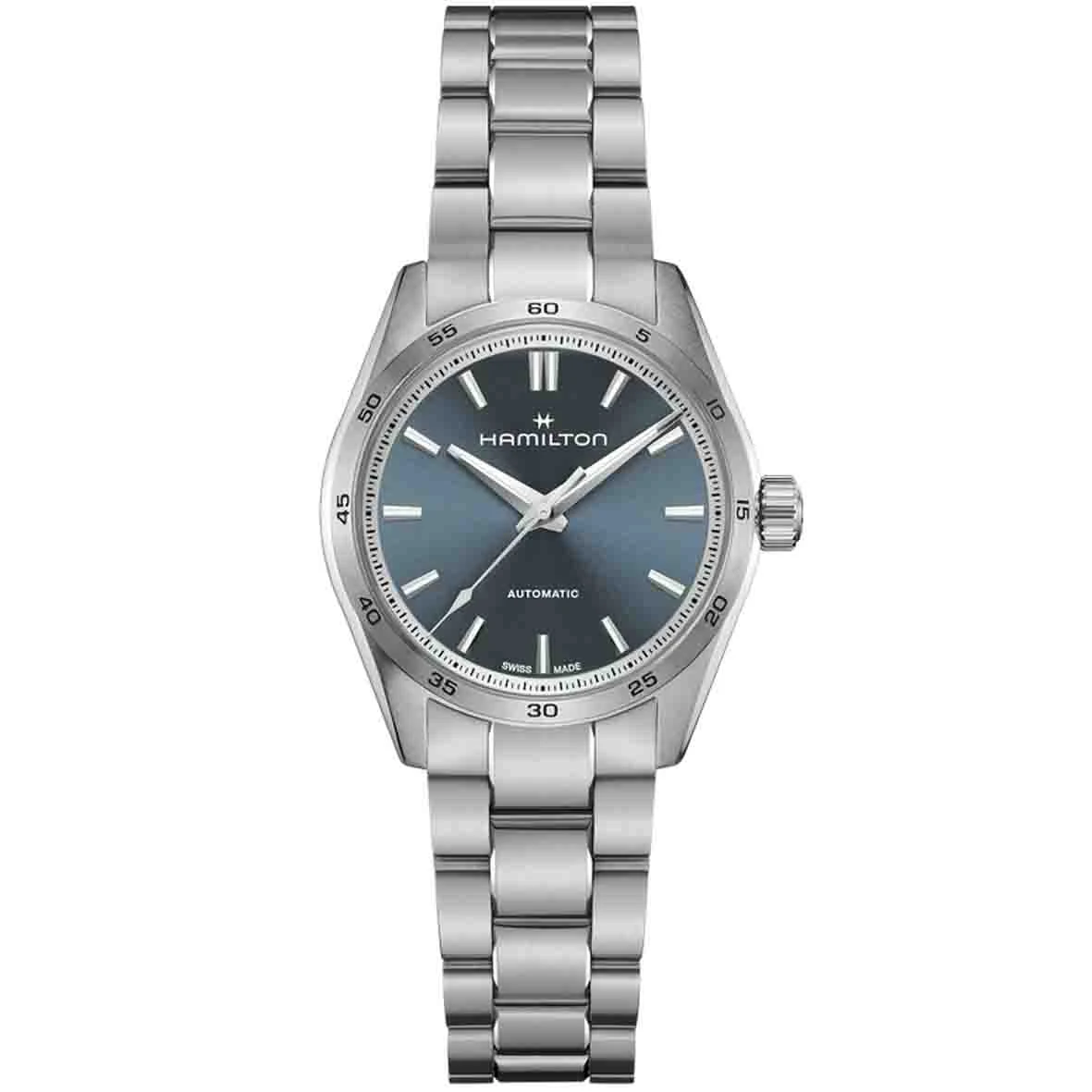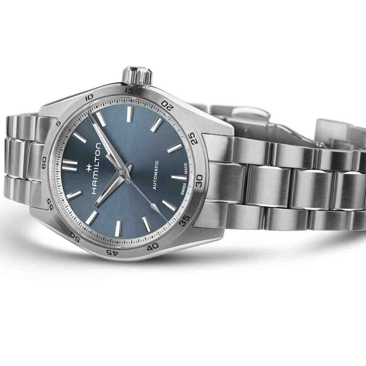 Animée par le mouvement automatique H-10 avec une réserve de marche de 80 heures, cette Jazzmaster Performer Automatic présente un boîtier de 34mm en acier inoxydable rehaussé d’un cadran bleu clair minimaliste et d’un bracelet épuré en acier inoxydable.