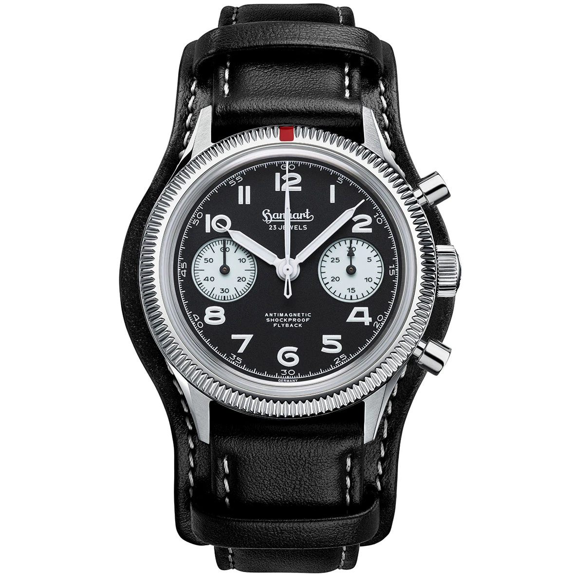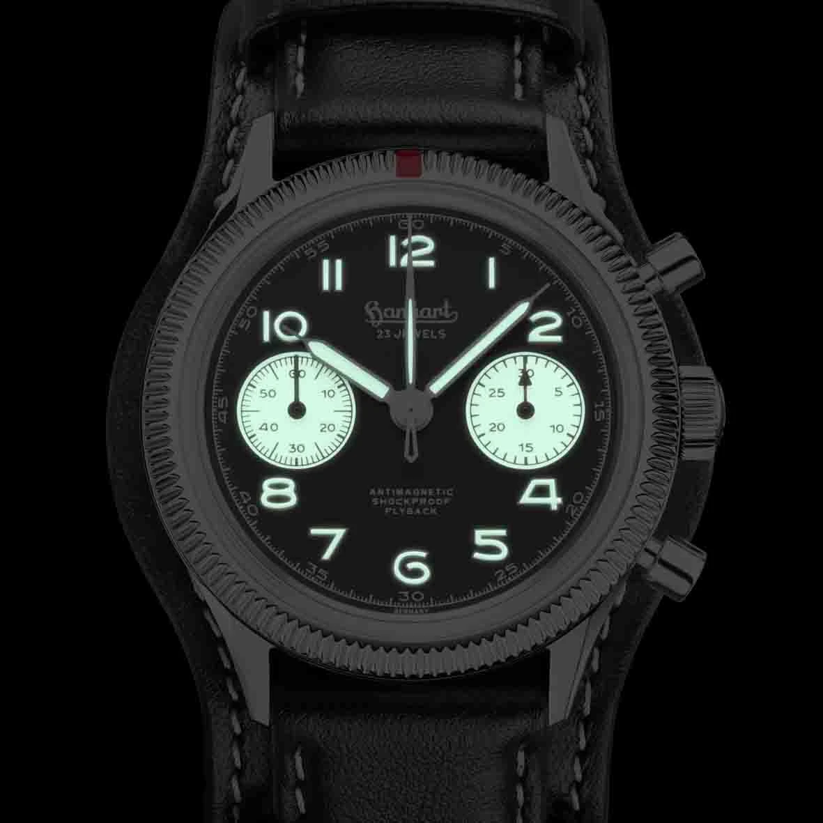Au premier coup d’œil, les caractéristiques distinctives d’un chronographe Hanhart classique sont immédiatement apparentes : la disposition asymétrique des boutons, le bouton de remise à zéro rouge et, selon le modèle, la lunette tournante cannelée et le bracelet en cuir intemporel avec rivetage satiné.