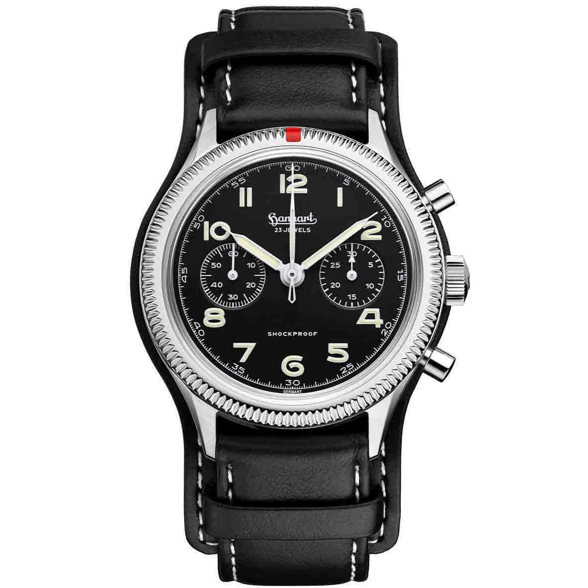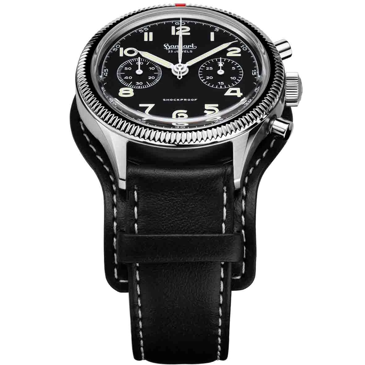 Au premier coup d’œil, les caractéristiques distinctives d’un chronographe Hanhart classique sont immédiatement apparentes : la disposition asymétrique des boutons, le bouton de remise à zéro rouge et, selon le modèle, la lunette tournante cannelée et le bracelet en cuir intemporel avec rivetage satiné.