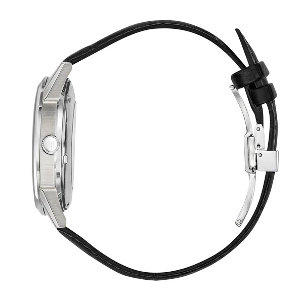 Le cadran de couleur argenté est doté d’index triangulaires en relief avec des aiguilles heure et minute argentées.