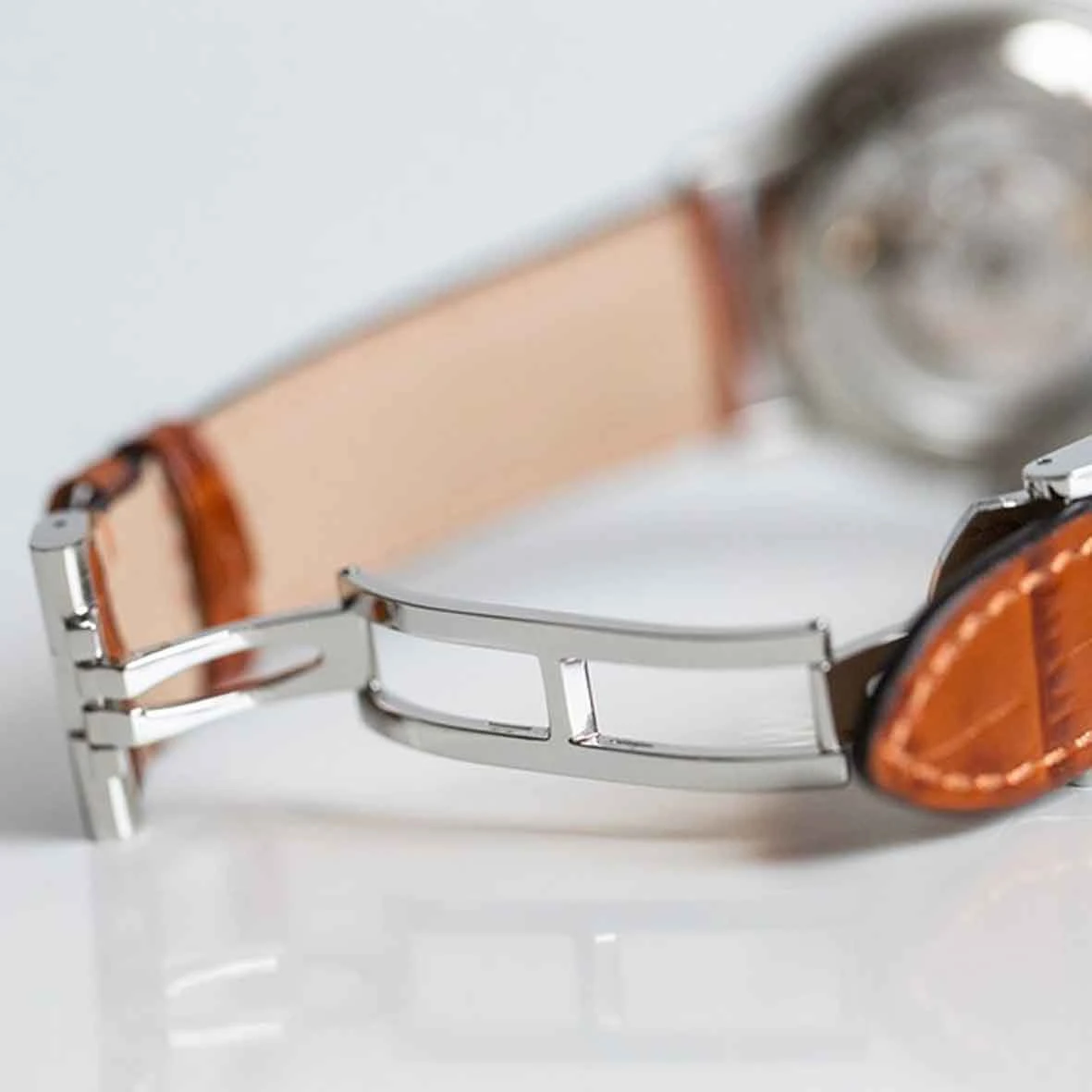 L’aiguille des heures tourne à 360 ° deux fois par jour et pointe avec précision les fins repères de cinq minutes autour du cadran.