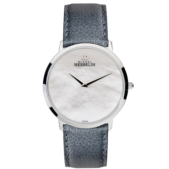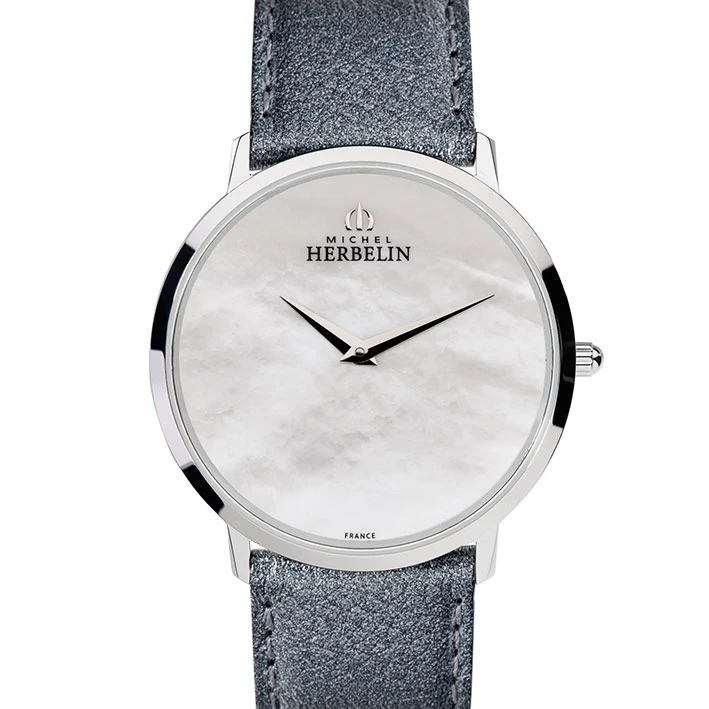 La beauté de cette pièce est accentuée par son cadran nacre blanc sans index aux aiguilles argentées.
