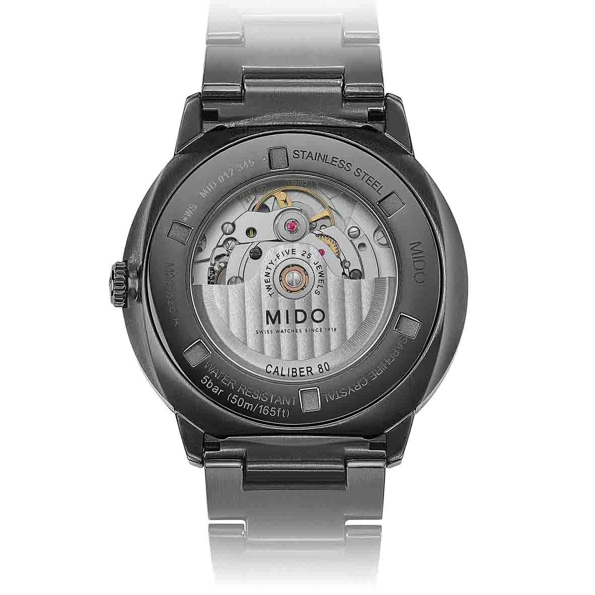 Finement décoré avec une masse oscillante ornée de côtes de Genève et du logo MIDO, le mouvement peut être observé à travers le fond de boîte en glace saphir de la Commander Big Date et de la Baroncelli Big Date.