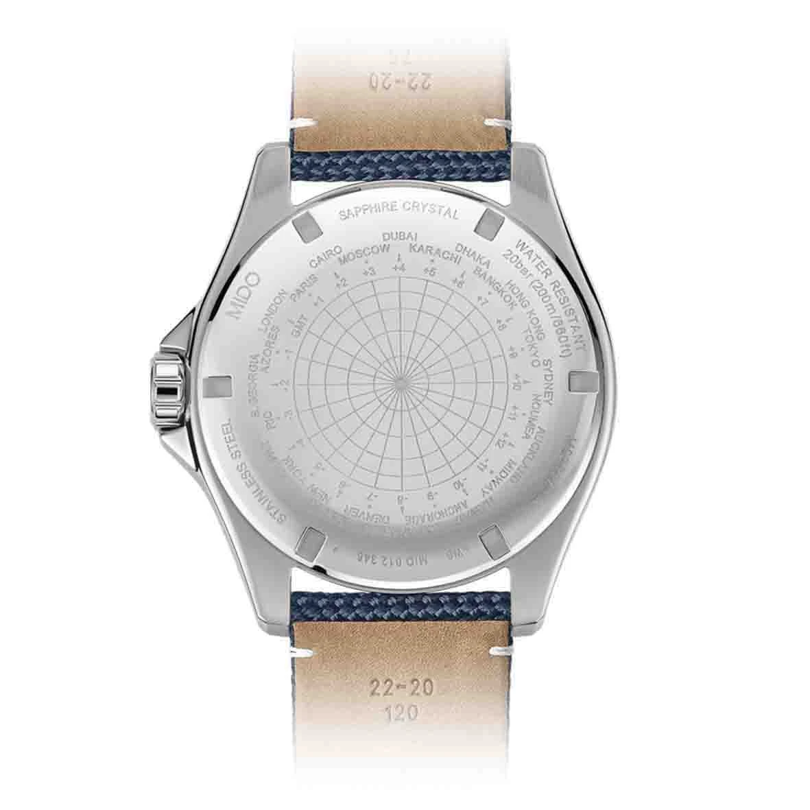 Sur le fond de cette montre dotée du Calibre 80, à la réserve de marche allant jusqu’à 80 heures, MIDO a gravé l’indication des fuseaux horaires.