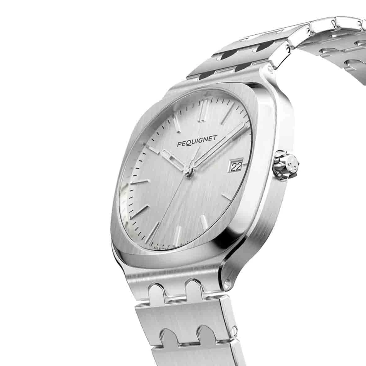 Ce garde-temps est conçu avec un bracelet, un cadran et un boîtier en acier combinés en une seule et même entité.
