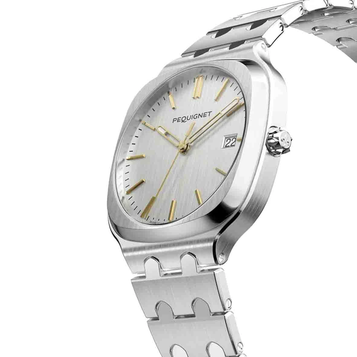 Ce garde-temps présente un cadran aux index dorés et un boîtier en acier associé à la nouvelle maille signature de Pequignet, subtile référence à la forme de l’obélisque de la place de la Concorde à Paris.