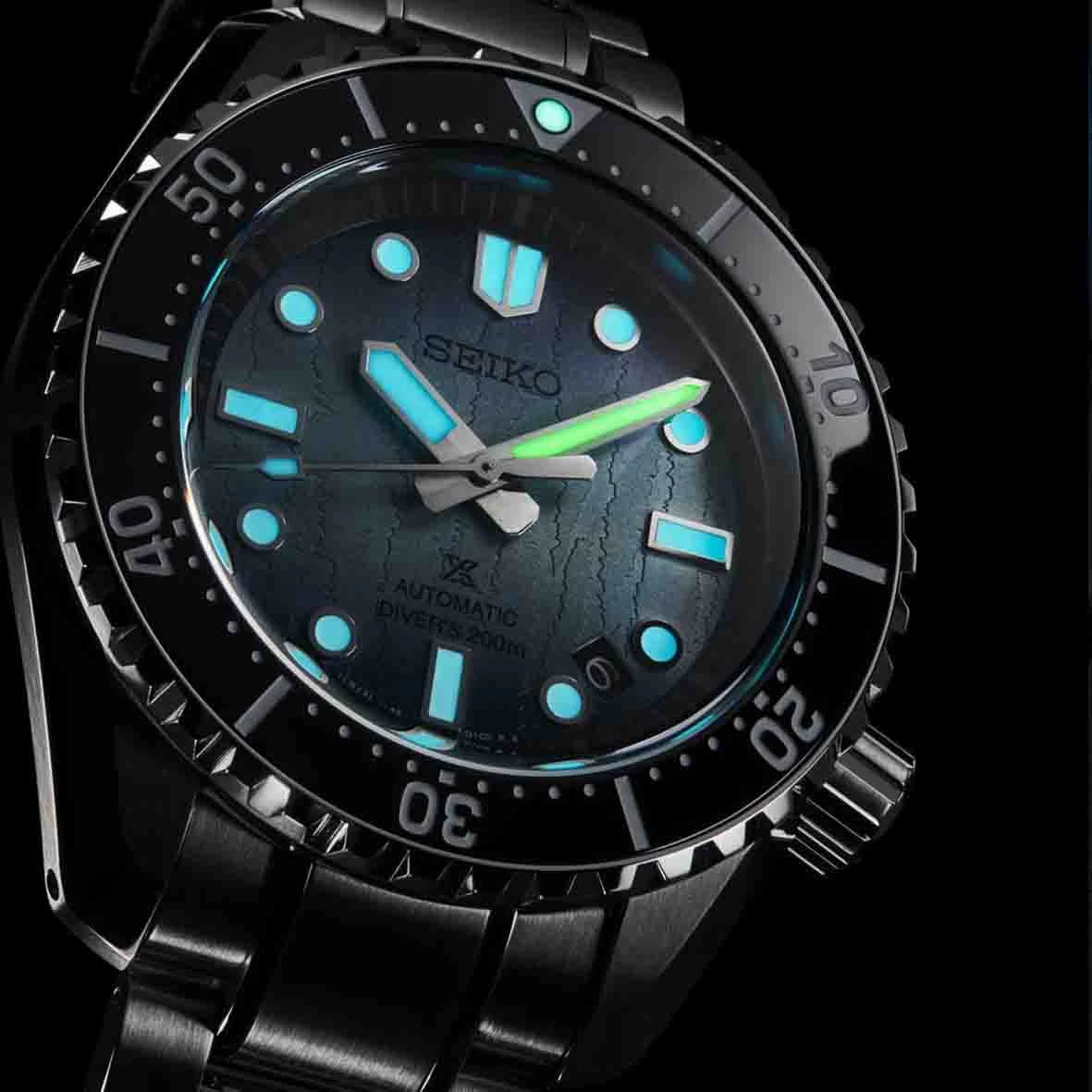 Les index sont revêtus de Lumibrite, une technologie luminescente de Seiko, offrant une lisibilité optimale même dans l’obscurité.