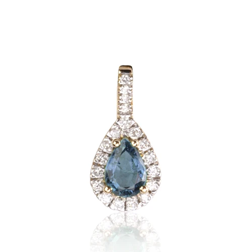 Ce pendentif de forme poire serti d’un saphir bleu au centre entouré de diamants.